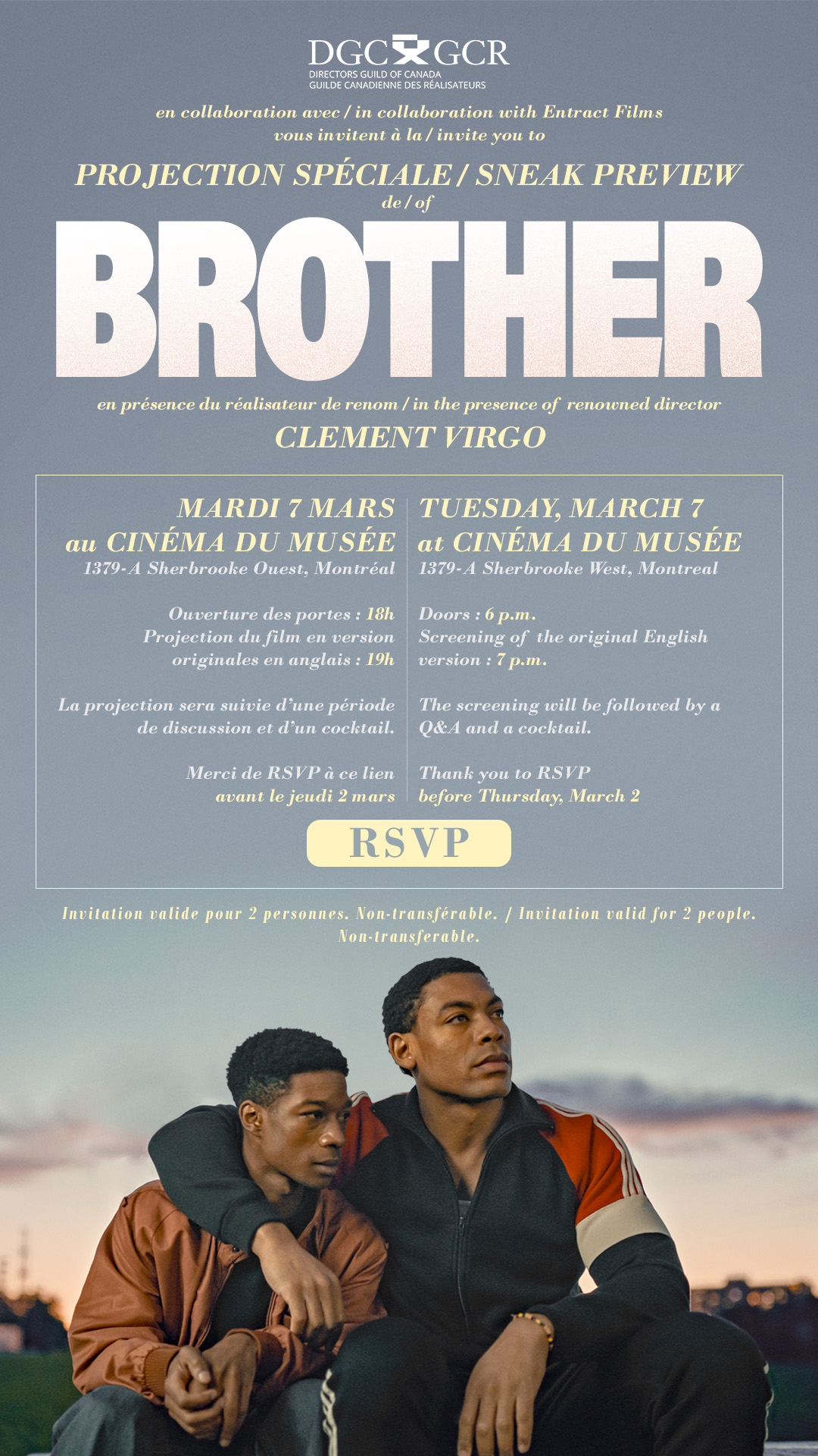 Sneak peak screening of Clement Virgo’s new film, “Brother” at Cinéma Du Musée with a special Q&A sessions afterwards with Clement Virgo and Philippe Falardeau.