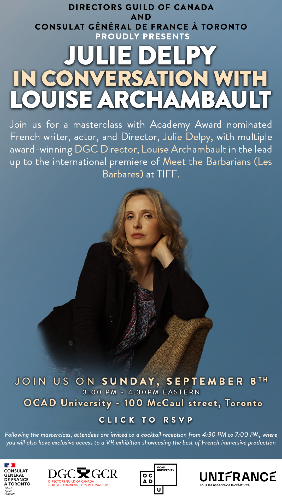 Join us for a masterclass with Academy Award nominated French writer, actor, and Director, Julie Delpy, with multiple award-winning DGC Director, Louise Archambault in the lead up to the international premiere of Meet the Barbarians (Les Barbares) at TIFF.